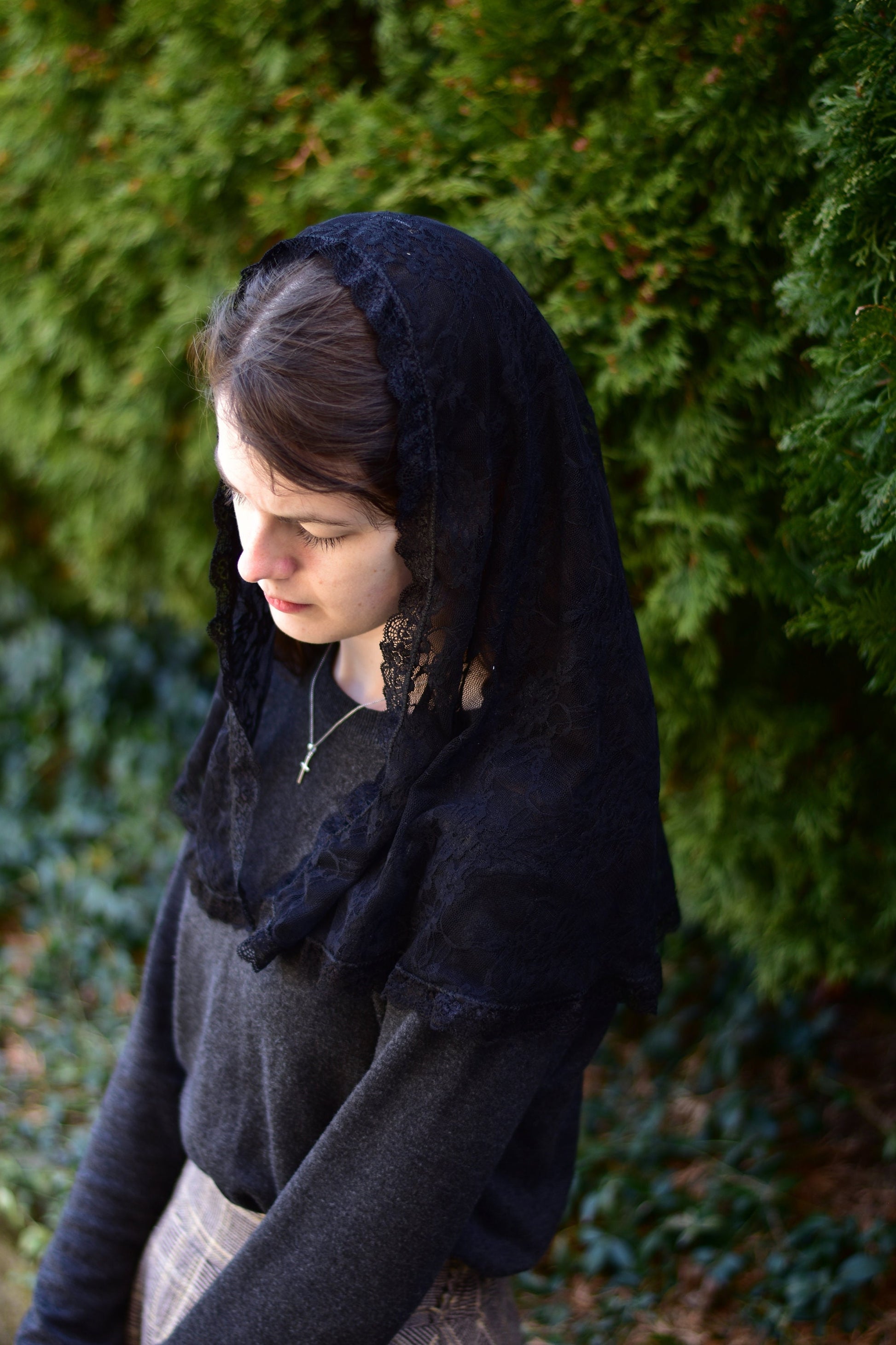 D shaped or half circle veil made of lightweight lace with some stretch to it.